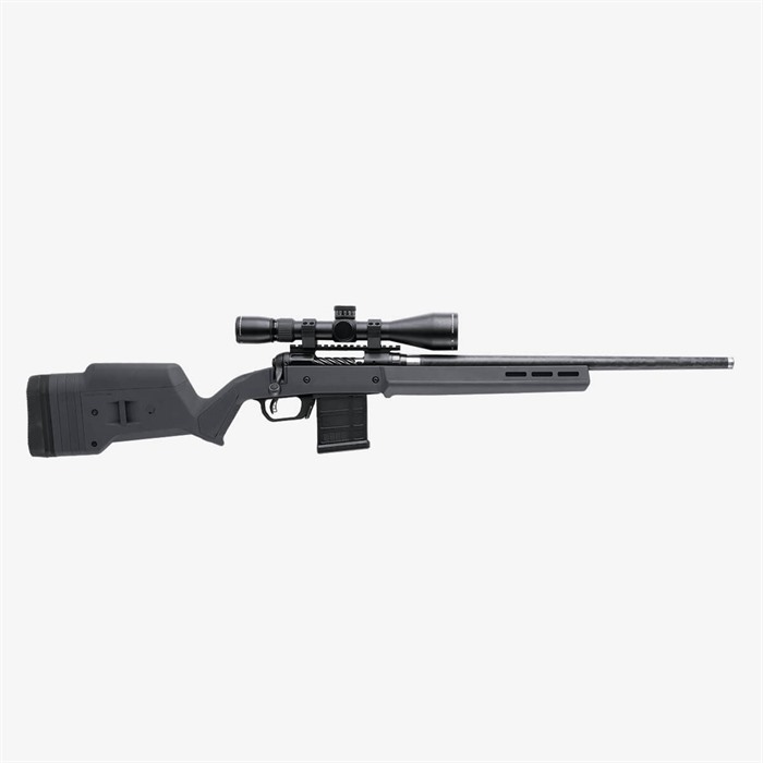 The Hunter 110 Stock – Savage 110 Short Action is the latest addition to the Magpul Hunter stock product line. It features enhanced ergonomics, versions for both right and left-hand actions, eight M-LOK® slots for mounting options, and a fully adjustable length of pull and comb height. These features have been optimally designed to provide a more stable shooting platform, improved user comfort and individual accessory customization. Like its predecessors, the Magpul Hunter 110 features a Type III hard anodized, machine-finished, cast aluminum bedding block that doesn’t require bedding and is a true “drop-in” stock solution. The Hunter 110 is designed for 3rd generation Savage short action Series 10/110 centerfire rifles that have center-feed magazine compatibility and action screw hole spacing of 4.40” (H-prefix and later) with production a date of 2006 and later. The Hunter 110 also includes Magpul’s Bolt Action Magazine Well for optimal functionality with AICS-spec detachable box magazines such as Magpul’s PMAG® 5 7.62 AC (sold separately). FEATURES Reinforced polymer shell with Type III hard anodized, machine finished, A380 cast aluminum V-bedding block. Available for right and left hand actions. Provides AICS-spec magazine compatibility for optimal performance and reliability (magazines sold separately) Made in the USA. SPECS Collection: Hunting Stocks Platform: Savage® 110 Butt-Pad Dimensions: 1.5 in W x 5.0 in H LOP Adjustment Range: 13.0 in, - 15.0 in. (13 in. with no spacers plus up to four half-inch spacers) Weight: 3.3 lbs. Width of Butt, max: 1.5 in. Width of Forend, max: 2.3 in. Compatible with 3rd generation Savage short action Series 10/110 centerfire rifles with center-feed magazine compatibility and action screw hole spacing of 4.40” that began in 2006. Compatible with barrel profiles up to Medium Palma and Savage Varmint barrel contours. Tapered Beam design provides rigidity through the forend and will free-float compatible barrels. Push-button QD swivel compatibility with optional Sling Mount Kits in rear of stock.