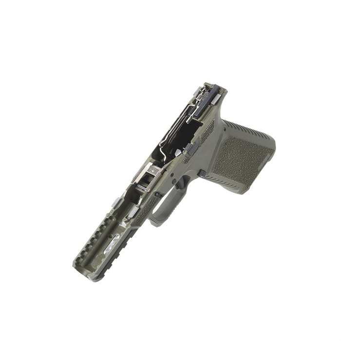 Die Rahmenmontage umfasst: SCT17 Polymerrahmen, elektroless Nickel-Sperrblock, polierte Abzugsgruppe mit elektroless Nickel-Abzugsstange und Polymerabzug, standardmäßigen Polymer-Magazinfang, Magazinfangfeder, Stahl-Abzugsstift, Stahl-Sperrblockstift, standardmäßigen Schlittenfang, Schlittenfang-Spiralfeder, Polymer-Abzugshaussstift, Abzugshaus mit GEN4-Stil Auswerfer, standardmäßiger Schlittenfangbaugruppe und poliertem 5,5 lb. elektroless Nickel-Abzugsverbinder.