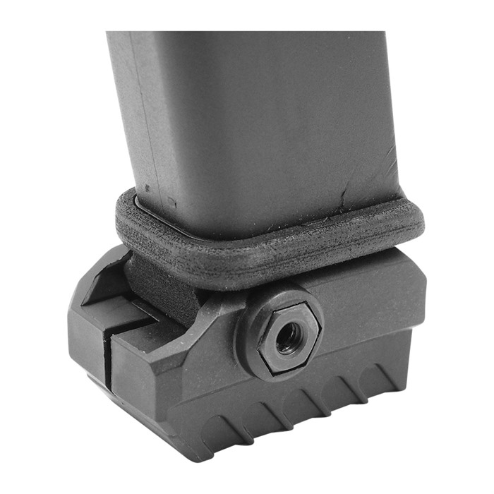 Zusätzlich gibt es den Universal Rail Adapter: Ein Picatinny-Schienenadapter, der an der Unterseite einer bestehenden Magazinbodenplatte befestigt wird. Besonders nützlich, wenn du kein Holster hast, das für eine Lampe geeignet ist, und mit Holster-Zügen trainieren möchtest.