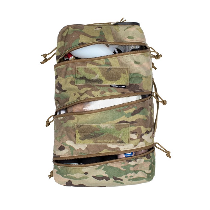 Das Hauptfach der Delta Bag hat ein Klappdesign mit zwei vollständigen Schlaufenfeldern, die alle hakenbackenden Zubehörteile (einschließlich der gesamten Reihe von Spiritus Systems Utility Inserts und anderer Produkte von Drittanbietern) akzeptieren können.