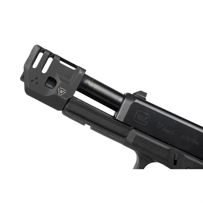 Die Kompensator des MDC-Systems hat ein erweitertes Bohrungsmaß, um Baffle-Strikes und Keyholing-Runden zu reduzieren, sowie einen 2,5 mm Reliefschnitt an der Oberseite des Rückens, um „Lipping“ und Schäden an der Vorderseite des Pistolenschlittens zu vermeiden.