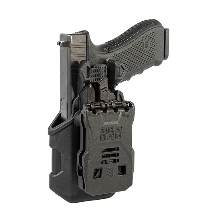 - Aktivieren Sie die daumenaktivierte Sicherung, um sicherzustellen, dass die Waffe sicher im Holster bleibt.