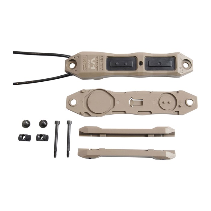 TAPS (Tactical Augmented Pressure Switch) from TNVC and Unity Tactical is a complete one point command and control system for all weapon-mounted electronics. It provides low profile, dual-device control for lights and lasers. TAPS mounts directly to any industry standard rail, including M1913 Picatinny, KEYMOD, and M-LOK. No third party rail adapters are needed, keeping the weapon lighter and sleeker. It features two on-board buttons and two accessory leads. Available in 4 button configurations, TAPS SYNC utilizes a patented double pole dome switch to fire both devices simultaneously on isolated circuits to protect your devices. This TAPS switch comes standard with a Surefire Light lead and MIL-Standard / Crane Laser Lead that fits NATO standard lasers from Insight Technology, Steiner, B.E. Meyers, and others. TAPS is waterproof to 1 meter for 30 minutes when properly installed on a rail, and features more durable buttons than many competing pressure switches on the market. Its hardened housing will keep TAPS standing up to the rigors of the battlefield TAPS SYNC allows the user to fire two devices simultaneously with one button, and is available in 4 button variations: Variant 1 – Button1: Light | Button2: Light + Laser Variant 2 – Button1: Laser | Button2: Light + Laser Variant 3 – Button1: Light + Laser | Button2: Light Variant 4 – Button1: Light + Laser | Button2: Laser Note: the dual-function SYNC button requires a slightly higher activation force than the standard single device button. Mode(s): Momentary Only Weight: 2.25oz w/hardware Waterproof: 1 meter for 30 minutes