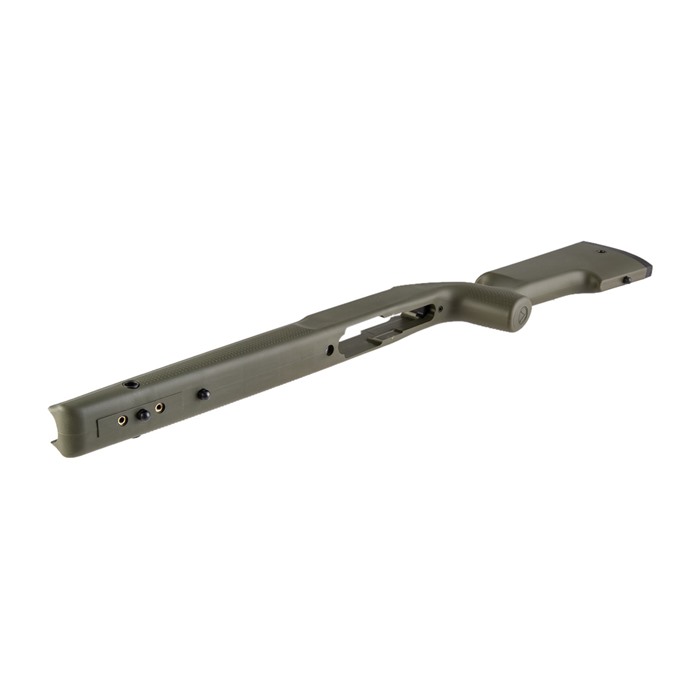 The Titan 1022 Precision Rimfire Stock from the Victor Company helps you maximize the performance of your Ruger® 10/22® rifle. It provides a comfortable, ergonomically enhanced interface between you and the gun, plus a solid platform for the barreled action that takes precision shooting with your 10/22® to a whole new level. Made from an ultra-rigid fiberglass composite resin, the Titan 1022 stock has almost zero flex, so it gives consistent, rock-solid support to the action. Victor’s Anchor Lock System employs a hardened aluminum bedding block up front for the action screw, while a separate block and screw anchors the rear of the action. The result: any hint of accuracy-compromising "play" between action and stock is eliminated. Easy, drop-in installation 2x quick-detach sling swivel sockets up front Traditional under-stock swivel studs, too Thick rubber recoil pad for solid, non-slip shoulder contact Accommodates heavy barrels up to .920" O.D. Weighs 2 lb. 11½ oz. The Titan 1022’s contoured, upgright pistol grip puts your hand at a natural angle for excellent trigger control, while the elevated comb positions your head comfortably for correct sight alignment. Texturing on the forend and pistol grip gives you a secure hold in wet or dry conditions. The underside of the Titan’s forend accepts Victor’s bolt-on Mini Picatinny Rail (sold separately) for mounting a bipod, light, IR illuminator, or other gotta-have accessory. The Titan 1022 precision stock accepts any good-quality non-takedown .22 LR 10/22® action, including the Ruger® factory receiver and those from Volquartsen, Kidd, and Tactical Solutions. Need a higher cheeckweld? Try the Titan Stackable Cheekrest, available separately.
