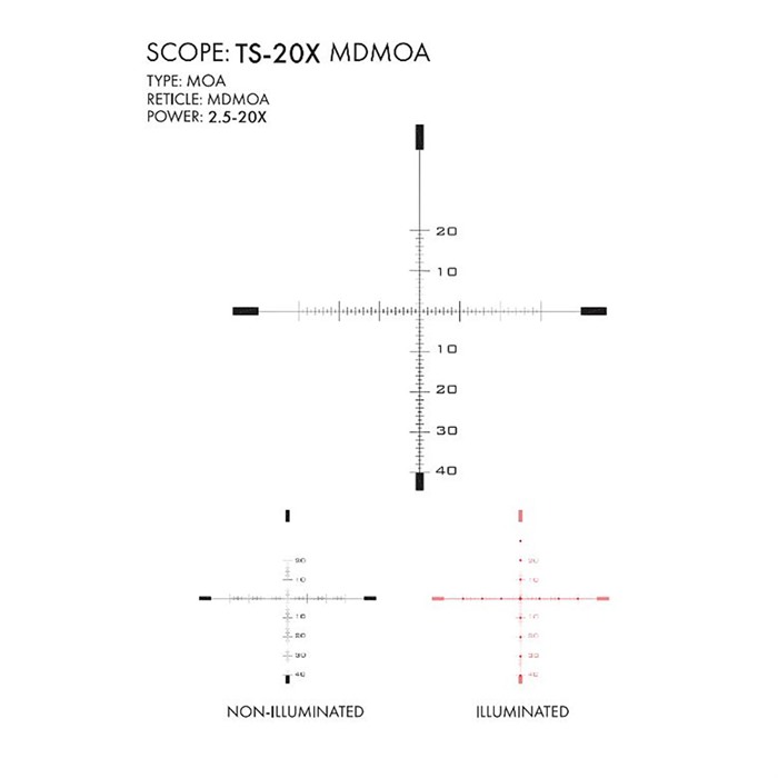 As rifles and ammunition become more capable of accurately and consistently dropping game at extended distances, long-range hunters have a need for an optic that provides the clarity and magnification they need to get on target. Too, long-range competition shooters are in need of an optimized riflescope that ensures their ability to ring steel at the outer limits of their rifle's range. The US Optics TS-20X is the perfect option for the range or field rig. The US. Optic TS-20X's construction on a large 34mm tube ensures that it'll be tough enough to withstand rugged use in the field, as well as leave room for the increased adjustment needed to land rounds at long range. Available in a 2.5-20X magnification range, this optic provides the power necessary to dial-in that extreme shot while allowing shooters to back off for a better view downrange. Length: 14.64 inches Tube size: 34mm Weight: 28.7 ounces Adjustment value: 1/4 MOA; 1/10 MIL Available with four different reticle options, the US Optic TS-20X features an illuminated reticle that provides a clearly marked center dot for easy aiming in any lighting conditions. No matter what model you choose, all TS-20X reticles are located in the first focal plane, so you know your in-reticle subtensions are accurate at any magnification power.