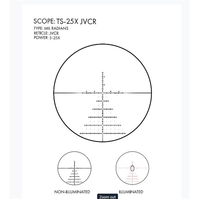 Having more magnification in the field or at a competition shoot can be a helpful advantage in certain scenarios, and with an optic that has a wide enough magnification range, you can get the best of all worlds in one scope. The US Optics TS-25X is designed to provide that versatility in an optic that works as well on a hunting rig as it does on a long-range precision platform. The US. Optic TS-25X's construction on a large 30mm tube ensures that it'll be tough enough to withstand rugged use in the field, as well as leave room for the increased adjustment needed to land rounds at long range. Available in a 5-25X magnification range, this optic provides the power necessary to dial-in that extreme shot while allowing shooters to back off for a better view downrange. Length: 14.17 inches Tube size: 30mm Weight: 27.3 ounces Adjustment value: 1/10 MIL Available with either a Carolina Mil Scale or JVCR reticle, the US Optic TS-25X features illumination that provides a clearly marked center dot for easy aiming in any lighting conditions. No matter what model you choose, all TS-25X reticles are located in the first focal plane, so you know your in-reticle subtensions are accurate at any magnification power.