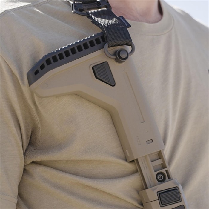 Der Magpul UCS (Universal Carbine Stock) ist so konzipiert, dass er optimal an eine breite Palette von Feuerwaffen passt, die über eine vertikale M1913 Picatinny-Schiene an der Rückseite des Empfängers verfügen. Um die unterschiedlichen Stile von Ladehebeln, Auswurföffnungen und Steuerungspositionen zu berücksichtigen, verfügt der UCS über ein umkehrbares Scharnier für links- und rechtsseitige Klappkonfigurationen sowie über fünf Grad Drop für ausreichenden Platz.
