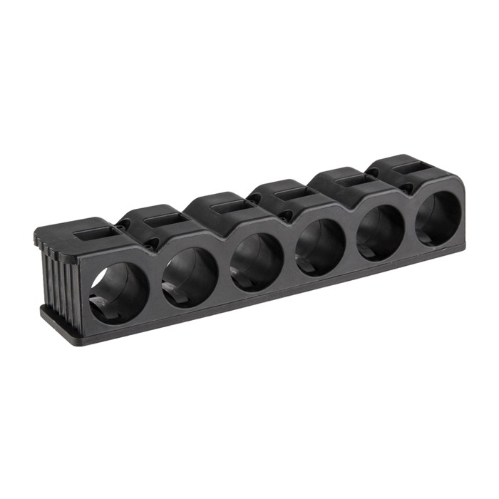 Der Universal Detachable Shotgun Shell Carrier ist mit einem zweigeteilten System ausgestattet und wurde für die Verwendung an Remington- und Mossberg-Empfängern entwickelt. Eine Aluminium-Rückplatte wird am Empfänger der Schrotflinte befestigt und verfügt über eine taktile Lasche, die sich am hinteren Ende des Empfängers überlappt. Drücke einfach auf die Lasche, um den Patronenträger zu lösen, und ein neuer Träger kann schnell an seiner Stelle hinzugefügt werden.