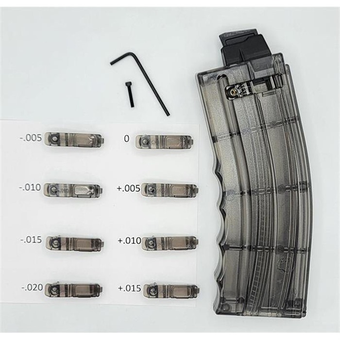 Das neue Magazin, auch bekannt als Version 208, bietet acht schnelle Wechsel-Einsätze an der Verriegelungslasche. Mit dem beiliegenden 3/32 Zoll Inbusschlüssel kannst du eine Schraube lösen, um die Einsätze in 0,005 Zoll Schritten nach oben oder unten zu ändern und die gewünschte Zuführhöhe für dein individuelles Kit oder deine Feuerwaffe zu optimieren.