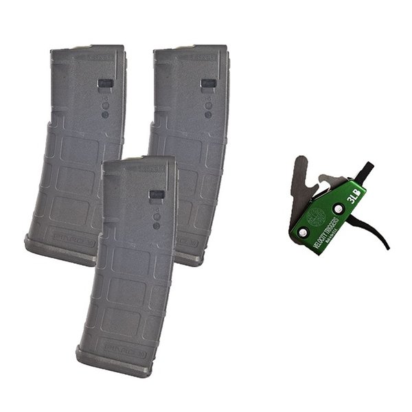 The Velocity Trigger for AR-15 rifles is a Single Stage Drop-In Trigger that provides a nice, clean & crisp trigger pull. The attractive price makes a quality AR-15 trigger achievable with any budget. Simple installation makes the process easy & quick. 3lb trigger pull. Not to be used with 9mm conversions or other recoil operated conversions. Paired with two exceptionally rugged, combat- and competition-ready Magpul 30-rd PMAG magazine. Corrosion-proof, self-lubricating one-piece body of fiber-reinforced, molded polymer has no spot welds or joints to impair the follower, and the constant internal curve ensures smooth, unobstructed movement of the round stack. Anti-tilt follower stabilizes the stack to help prevent nose-diving and bolt-over-head failures. Heat-treated, stainless steel spring is stress-relieved for optimal performance. Withstands the heat from prolonged full-auto fire and is not harmed by most bore cleaners and solvents. Exterior ribbing provides added gripping surface; magazine catch notch, rather than a traditional hole, keeps dirt and debris out. Easy-to-grasp ledge on floorplate aids in extracting magazine from pouches; floorplate removes easily for cleaning. All models available in Black. DO NOT COME WITH DUST COVERS.