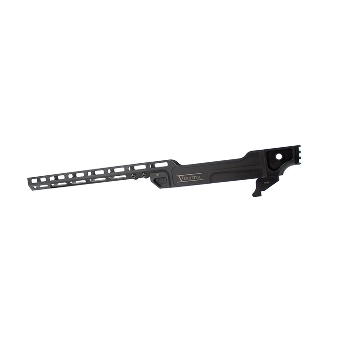 Discover the pinnacle of firearm enhancement with the Vendetta™ chassis system. Crafted from high-quality aluminum, this chassis not only enhances the aesthetics of your firearm but also delivers unparalleled durability and performance. The M-LOK® rail provides a versatile platform for mounting lights and other accessories, allowing you to customize your setup to suit your shooting needs. Ships with Chassis, Rail, Grip Insert, Grip Insert Screw, 6 Rail Screws, and 2 Allen Keys. FEATURES: Material: 6061 T6 Finish: MilSpec Type II Anodized Lightweight Design with Slim Profile (15 oz.) Free Float Rail with Centrally Positioned MLOK® Slots Machined-in QD Sockets Compatible with All Standard AR-style Grips 5° angled back rail for Folding Stocks or Braces Compatible with Fixed Barrel Ruger® 10/22® Pattern Barreled Actions Manufactured in the USA Limited Lifetime Warranty