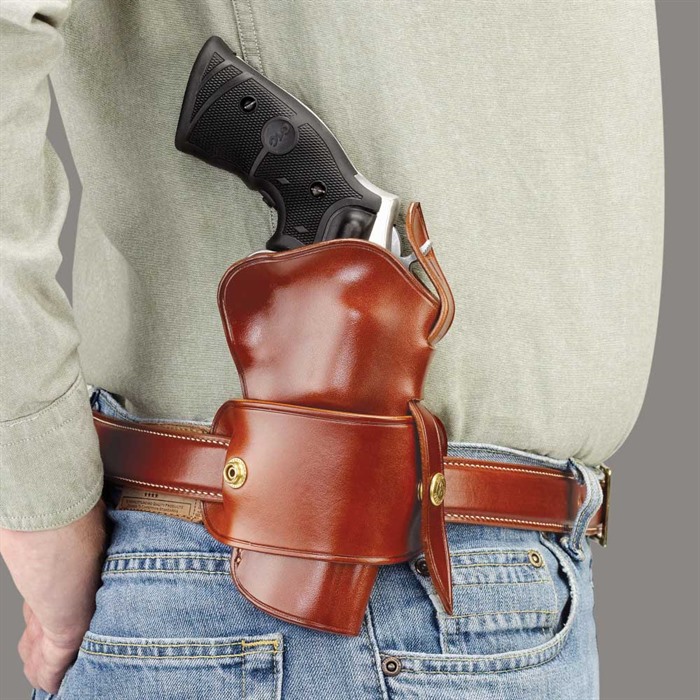 Galco’s extremely versatile new WheelGunner offers ambidextrous design as well as the ability to be used strong side or crossdraw. Suitable for both casual concealment and outdoor sportsman’s carry, the WheelGunner carries a medium- or large-frame revolver high and close to the body. Using an innovative belt slide system, the WheelGunner can be used for both strongside or crossdraw carry. Fully ambidextrous, the WheelGunner allows carry in four different positions, simply by unsnapping the holster from the belt slide, moving the belt slide to different locations on the belt, and reattaching the holster. Strongside or crossdraw on either right or left sides – the WheelGunner does it all! The WheelGunner secures the revolver with a combination of hand molding and an adjustable hammer thong. Simply slip the hammer thong off and the gun is cleared for a fast, smooth draw. Constructed of premium saddle leather, the ambidextrous WheelGunner fits belts up to 1 3/4” and is available for single- and double-action revolvers in tan color.