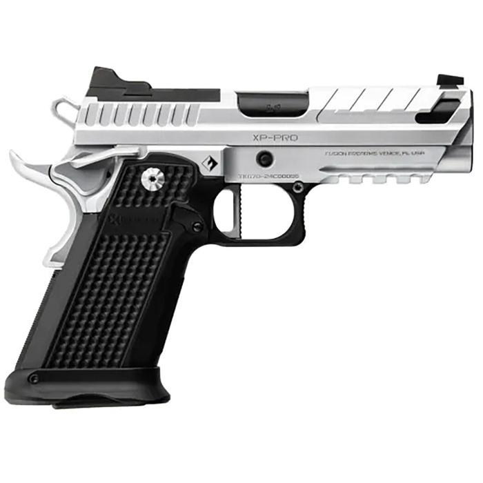 FUSION FIREARMS XP PRO™ 9MM LUGER SEMI-AUTO HANDGUN CHROME Introducing the new patent pending XP PRO™, the next generation of double-stack 1911 pistols. This 1911-based platform is engineered to take Glock® 17 magazines, seamlessly blending classic design with modern functionality. Constructed from all bar stock materials and precision CNC machined, the XP PRO™ ensures exceptional durability and performance. The only polycarbonate component is the magazine catch, designed to perfectly accommodate Glock® magazines. The XP PRO™ features a 4” tri-topped slide with pro cocking serrations and front vent cuts, providing a sleek and aggressive look while enhancing functionality. The sights are standard Novak® compatible front and rear combat sights, with the rear sight mounted on a removable plate to accommodate RMR red dot sights. An RMR plate is included, allowing you to mount RMR/SRO red dot sights right out of the box. The trigger is a one-piece steel milled trigger made from bar stock, ensuring a crisp and reliable pull. The barrel is a standard 4” 1911 Clark/Para ramped bull barrel, chambered in 9mm, paired with a one-piece full-length guide rod for superior recoil management. The XP PRO™ comes standard with an ambidextrous thumb safety, providing versatile and accessible safety control. The steel frame is equipped with a tactical rail, ready to accommodate Picatinny accessories for enhanced customization. The aluminum grip features a chainlink pattern and a checkered front strap for a secure hold, complemented by a removable magwell for quick and efficient magazine changes. Additionally, the XP PRO™ boasts a wide paddle pro slide stop, adding to its tactical appeal and ease of use. To ensure premium durability and corrosion resistance, the XP PRO™ is finished with a Tennifer® QPQ coating, renowned for its superior performance in demanding conditions. The XP PRO™ represents an innovative collaboration between Fusion Firearms, renowned for their expertise in crafting premium 1911 models, and Ermox, a leading firearm manufacturer. This partnership has given birth to the XP PRO™, a double-stack variant of the classic 1911, designed to accommodate Glock® magazines, offering unparalleled versatility and compatibility. This project marries the in-depth knowledge and craftsmanship of Bob Serva and the Fusion team with the sophisticated manufacturing techniques of the Ermox team, resulting in a firearm that is rich in features yet surprisingly affordable. With its robust construction, modern features, and compatibility with Glock® 17 magazines, the XP PRO™ sets a new standard for double-stack 1911 pistols. Experience the perfect blend of tradition and innovation with the XP PRO™, a testament to the synergy between these two renowned firearm manufacturers, setting a new benchmark in the industry for innovation, quality, and value. SPECS Platform: Metal Striker-Fire Caliber: 9MM Magazine Compatibility: Glock® magazines Construction: All bar-stock materials, precision CNC machined Barrel: 4” fluted Glock® Gen 4 compatible threaded, Tennifer finished Sights: Fixed combat sights, optic-ready with RMR and RMS/C plates included Trigger: Competition flat-face, one-piece steel milled Grip: Interchangeable panels, black & red included, aluminum & poly construction Frame: Aluminum with tactical rail, Sure Grip checkering, hard coat finish Slide: Pro Serrations, Pro Window Cuts, Tennifer Finished Recoil System: Full metal, Glock® Gen 4&5 compatible Overall Length: 7.29 inches Weight: 26.5 oz / 1.66 lbs